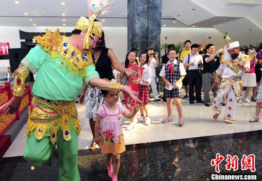 资料图:国家级非物质文化遗产傣族孔雀舞传承人旺腊、被人称为“活孔雀”的国家级非物质文化遗产傣族孔雀舞传承人约相等教榕台小朋友跳世界非物质文化遗产“孔雀舞”。中新社发 张丽君 摄
