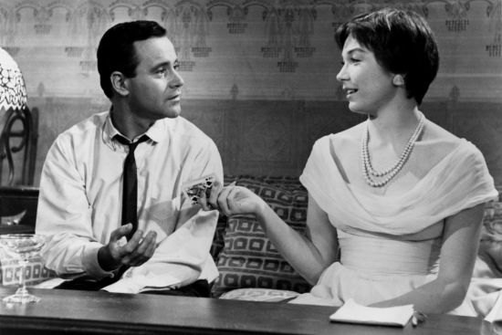 这是棋子和玩物、被侮辱与被损害者的爱情。然而,比起《热情如火》,这两个角色显然得到了更多的真情实感。库布里克的“签名”是浴室,每部电影 里都有一幕发生在浴室,而怀尔德的“签名”是“牌桌”,几乎每部电影都有人在打牌。怀尔德认为,他最早受到的人性教育是在台球室,在那儿他看惯了赌局, “关于人性我学到了很多,没有一样是值得赞许的”。这样认识这个世界的他,难怪会执著地喜欢以骗局构筑故事。《日落大道》里玩牌的是“蜡像”们,《热情如 火》里则是黑帮,而《桃色公寓》以一个玩牌的场景结束。那是只属于巴克斯特和弗兰两个人的牌局。