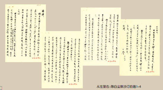 文学馆藏陈白尘致沙汀信一封,用“人民文学”笺,毛笔竖行写,字体遒劲,落笔洒脱,满满4页纸,不删不改一气呵成。抬头直呼“老沙”,足见彼此间的熟稔。是私人通信而无私密可言,信笔所记都是当年的文坛大事。一封信关系两位文化名人,无论从什么角度看都是不可多得的“文献”“文物”。 “窖藏”半个多世纪之后抄录于此,再加上些拉拉杂杂的“漫说”以助读。