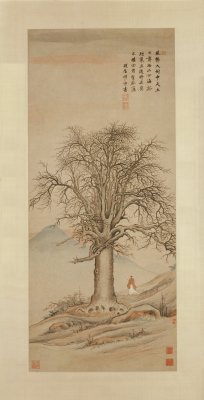 《大树风号图》轴,明,项圣谟作,纸本,设色,纵115.4cm 横50.4cm.