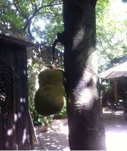 中山路自在咖啡的后院,像是红尘之外的清凉之地,戏楼、老墙、旧门、草帘子、泡菜坛子和绿树古藤相映成景,仿佛时光在这里停滞了,邀请红尘中忙碌的人们坐下来歇脚。采风团的作家们刚刚坐定,又被一棵菠萝蜜树抢夺了眼球,树中间长出了一颗硕大的菠萝蜜果,据说还是处女果。佛教《心经》中的第一句经就是:“观自在菩萨行深般若菠萝蜜多时,照见五蕴皆空。”而这经的全称又叫《般若菠萝蜜多心经》。菠萝蜜树长在海口,又结出硕大的果实,这证明此地的福报很大,是圣地。