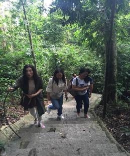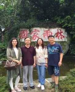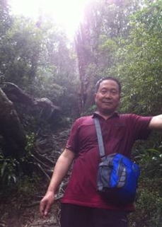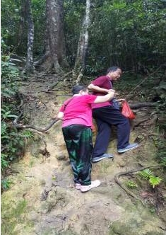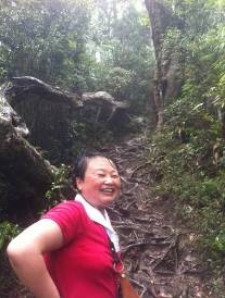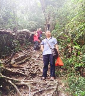 最初文友们三五成群轻松地走着,边走边欣赏路旁的凤凰花和龙花,并在国家雨淋的石碑下合影,每个人的脸上都是灿烂的微笑,也就没有对攀爬五指山的畏瑟。只有薛梅显出了为难之情,说自己的膝盖上有积液,担心下山时行走困难,但她还是跟着大部队前行,不到万不得已的时候不能掉队。而这里距五指山主峰3999M。