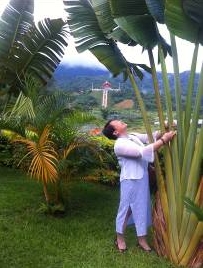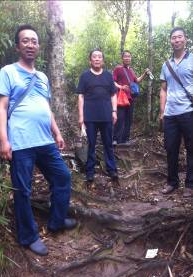 我们拍照时,梅主席又先行爬山去了,这使曾经始终走在前边的祁将军、孙玉民和我开始落后,我打量参天古树,祁将军指着一棵树说那是红木,他抢拍了镜头。我轻松地拔出一株小树枝,捏在手里想带回去当盆景。