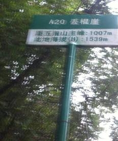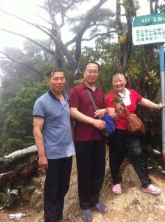 接近12点的时候,我们终于爬上了五指山的一峰,山上并没有庙,只是一小块平地,散乱着矿泉水瓶等垃圾,靠山路的一侧是一棵发黑的枯树干,树干横倒着,估计是雷击所致。祁将军、孙玉民和我在指示牌下拍照留影,我手里举着沿路採来的树枝,满脸开心自豪的笑着。这里是A27五指山一峰,海拔1839M,距五指山主峰二指还有370M。