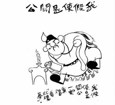 高龙生 (1903-1977) 的 《阿斗画传》 主要发表在《十日杂志》 上。“阿斗”是将三国时代扶不起的阿斗和鲁迅的阿Q结合起来的形象,他头顶瓜皮帽,身穿破衣衫,朴实的方脸上布满深刻的皱纹,看上去饱经风霜又老实可欺。这个阿斗逆来顺受,毫不掩饰自己的愚顽,大胆展露自己的弱点,而使人警醒,很有现代感。其中 《一个怪梦》最为惊悚:阿斗被蛇盘住,挣扎中被蛇吞入左臂,他干脆一斧子砍掉自己的胳臂,顺势砍下蛇头……