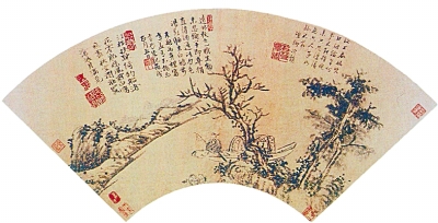古代扇画艺术是传统中国画门类中特有的语言形式,历代画家借以抒情达意,或寄乐林泉,放怀自然,或以物言志,含情蓄意。在传世的许多明清折扇中,画家们借景托物,写心写意,比兴多方,精于此道者,灿若繁星。超然脱俗的丹青佳作,已经成为中华文化艺术宝库中的重要组成部分,尤其许多经典的扇画艺术更是后世赏习、研究、临摹、借鉴的范式与楷模。纵观中国绘画史,我们领略传统中国画艺术博大精深的同时,也得益于历史给予我们的丰厚艺术资源的滋养。每一个时代笔墨技法、风格语言和师承变革都经历了一个不断探索和发展的过程。明清以来文人画家们融前人之精髓,采自然之精灵,创造了许多优秀技法,留下了丰富的珍贵画迹,令人叹为观止。这些历史文化遗产对于我们今天的学习、创作和研究,从而进行新的艺术探索,无疑都有着借古开今的现实意义和价值。历代中国画艺术语言的精神表现都重视主观思想和客观景物的对应和谐,他们怀抱自然,草木皆情,将笔墨的形质与画家的情趣、学养、品性、胸襟、抱负等精神内涵相融合。画家通过对自然表象的真切感悟转化为人文境界的匠心独运,此时的景物已不再是客观自然的真实描摹和状物再现,而是画家心灵意象的自然流露和精神寄托,是真情实感的自我人格写照。于是,笔墨、语言、风格、意境就有了更为生动鲜活的多元呈现。