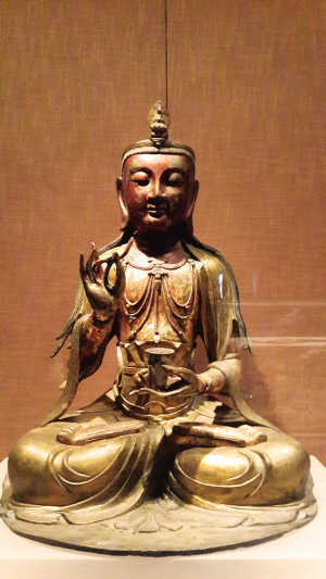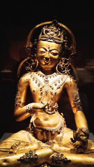 首都博物馆藏铜镀金金刚萨埵菩萨像(元)带项圈和长璎珞,并镶嵌绿松石。