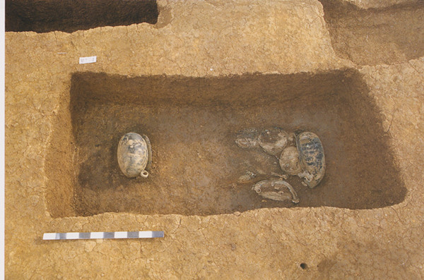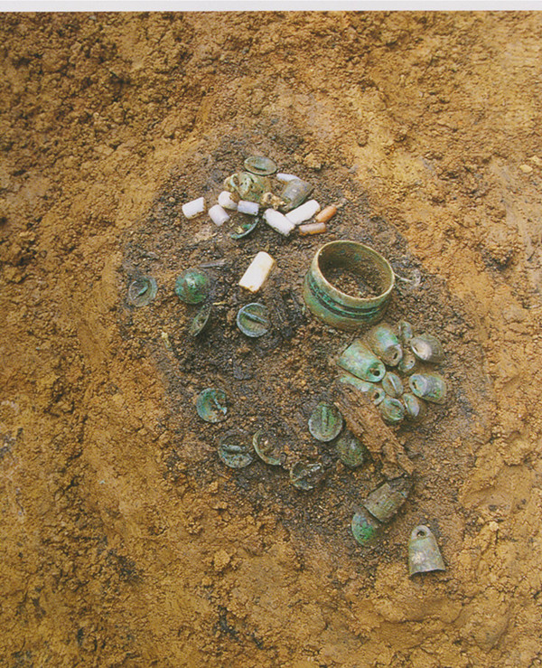 第二天一早,兴奋了一夜的队员们再次来到出土这些奇形怪状器物的祖家老包小土丘上,在朝阳的映衬下,那黄色的土地显得异常的亲切,仿佛它们已等了两千年,今天终于等来了破解这块黄土地下掩埋着的神奇密码的考古队。在祖家老包附近不同的土丘上,随着犁铧的条条犁痕,一座座土坑墓的墓边和里面夹杂着大量红烧土颗粒的墓葬填土异常醒目,不用说,这是一处与此前发掘的汉墓不同的青铜时代墓地。考古队也不急着收队回贵阳了,将正在发掘的汉墓清理完后,迅即转战祖家老包,当年即清理了25座夜郎时期不同于汉墓的地方土著民族墓葬,发现了非常奇特的“套头葬”和一批独具地域特色的青铜器,包括容器、兵器和装饰器等,真正揭开了贵州夜郎考古的序幕。