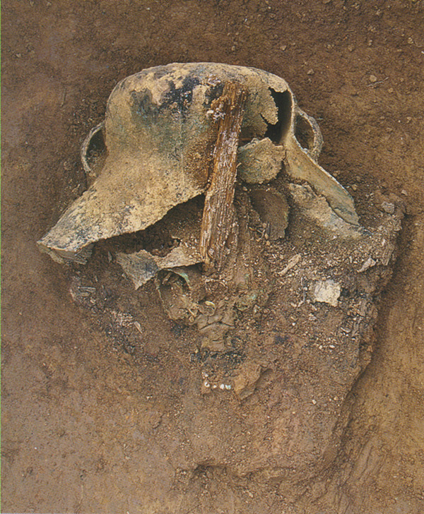 张合荣:应该是“套头葬”这一特殊葬俗吧,“套头葬”最早是在赫章可乐的墓中发现的,后来考古工作者把1976-1978年的发掘资料整理成《赫章可乐发掘报告》,编写者认为在清理的168座乙类墓中,有20座墓葬的葬式较为特殊,墓底一端侧放一釜(铜、铁釜均有)或一铜鼓,头骨置于其中,躯体则放墓底中部。其中M58葬式尤为罕见,在墓底一端侧放一铜釜,内放人头骨;脚端侧放一铁釜,内有脚趾骨。他们把这种将死者头部用大型铜器罩住的特殊葬俗称之为“套头葬”,其实,时至今日,这种奇特的葬俗在国内还仅见于赫章可乐,因而“套头葬”也成为可乐墓地的标志性文化特征。