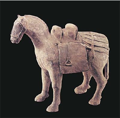 逐渐地人们发现,如果给马鞍右侧也加一枚马镫,骑马时双脚都能踩进去。这样一来前后左右都有了稳定的依托,成熟的双马镫终于横空出世,马具3.0版本正式完成,象山7号墓那件陶马,便是这一变革的最早物证。