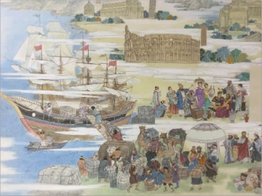 第三,是这幅作品的艺术品格。既然是表现丝绸之路的主题,这条横亘千古、绵延万里的长路自然不可或缺。作者们在创作者时,特别是谋划整体布局的过程中,始终让这条路时隐时现、时弱时强地贯穿着、连缀着、绵延着。同时,作者们借鉴中国画的传统技法,在不同的景观、情节的连接处,施以不同造型、蕴含不同气韵的祥云、雾霭、烟岚等,既为画面铺陈出不同的氤氲和背景,也在增添着画面的流动感、连贯性。这些努力和探索,让这幅由一个个片段性场面、情节、段落组成的巨幅画卷有了一条不间断且贯穿始终的气脉,从而让这幅巨幅作品统一在一以贯之的气韵之中,给人以一种气韵连贯、一气呵成的感觉,而没有丝毫的阻滞断裂之感。这对于一幅长卷的创作来说,是难能可贵的。尽管总体上选择了现实主义的创作手法,但也不无浪漫主义的想象和夸张,如骑在奔马之上、身披飘舞彩带,缠绕着祥云霞光的飞天,毫无疑问,已经超越了写实的品性,而带上了综合、夸张、浪漫的色彩。