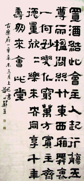 郑簠素来作书精勤,态度认真,其弟子张在辛于《隶法琐言》中言:“先生作字正襟危坐,肃然以恭,执笔在手,不敢轻下,下笔迟迟,敬慎为之。”而这幅藏于上海刘海粟美术馆的郑簠书法轴内容为晋傅玄所作《前有一樽酒行》,原诗为:“置酒结此会,主人起行觞。玉樽两楹间,丝理东西厢。舞袖一何妙,变化穷万方。宾主齐德量,欣欣乐未央。同享千年寿,朋来会此堂。”而诗中“丝理”被郑书为“丝竹”,不知是版本之讹还是笔误,俟考。然此并无碍这件作品的妙处,其妙处有三:一是作品中体现出的新理异态。于郑之前,隶书的用笔平直古板、结体整齐均匀,而这幅作品用笔有轻重的主次变化,融入草书的疏劲笔意。如“絲”“萬”等笔画的牵丝连带以及尾笔飞白的舞动,皆有草意。二是作品章法上字距宽疏、行距紧密的布局规律,气息面貌富有书卷气息,此常被唐以后多数写隶书者所忽视,而这也是令他成为清代碑学运动先声的原因之一。三是这件作品于“三月上巳”所书,以此诗记,可想当日他与友人流杯曲水饮宴之状,颇有书外情境。