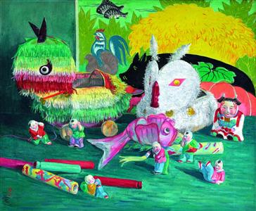 《新禧》创作于1966年。这是一幅充满中国味道的油画,它吸收了民间艺术,又有着强烈的色彩对比和装饰效果。周碧初把纸糊的兔子灯、鱼灯、五颜六色的炮竹以及神态各异的无锡惠山泥人放在一起,构成了既有对比又和谐统一、充满生趣的画面,浓烈的色彩中蕴藏着内心对新一年的期盼。