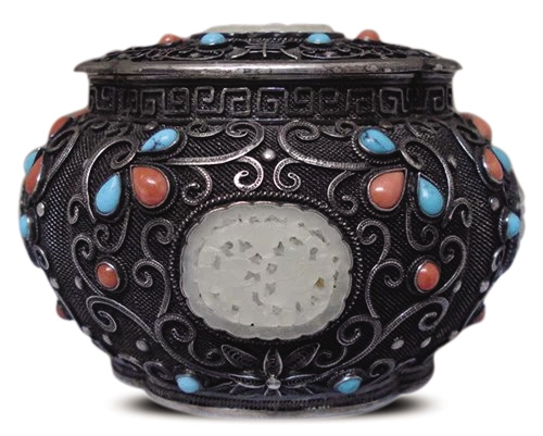 图中所示是一件清代银镶玉石珠宝香盒,高约6厘米,长约9厘米,纯银材质,并镶有白玉、珊瑚绿松石,盒身盒盖完整无缺。