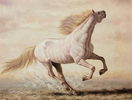 相比于风景画的宁静致远,骏马如风似电的身姿更能激发他喷涌的创作灵感。黄广亮认为,马为六畜之首,人与马似乎有着某种古老的盟约。热爱马的情愫,从权贵到百姓从无二致。黄广亮对马的痴迷令人难以想象,他对马的骨骼、肌肉、动态、习性都做过深入了解,尝试过用中西方不同的审美、不同的风格画马。千帆阅尽、返朴归真,随着个人绘画风格的渐趋成熟,黄广亮的骏马画形成了中西合璧、自成一派的个性标签。他画的马既有西洋画法重结构的严谨,更有传统国画重神韵的灵性。他爱马、画马,以马喻人,表现马的喜、怒、哀、乐和激情,也表现出自强不息、勇往直前的马文化的内在精神。