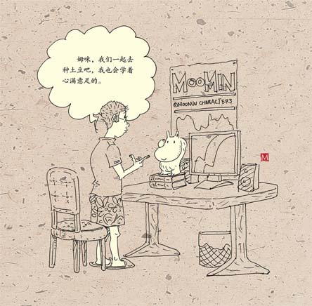 说姆咪天真,还不如说托芙·杨松有颗质朴、童真的心。姆咪不是说过只要能种种土豆,就已经心满意足了吗?从中我们也可以看出杨松平和、质朴的生活态度。俗话讲画如其人,看到稚拙天真的姆咪,我们一定能想象到托芙·杨松有着怎样的心境。而这种平和、宽厚、简单的心态,难道不是今天的我们所缺失的吗?打开任何一本姆咪的书,掩卷后都会让我思考良久。这些看似写给小孩子们的书,我们这些大人不妨也拿来读读,它会像闷热后一场淋漓的雨,荡涤了暑气和尘埃。提醒我们该回头看看,那些久违的纯真和快乐,究竟被我们甩下了多远。无数伟大的作品都曾告诉我们,它们是献给所有人的,从0岁到99岁,就像眼前的姆咪。
