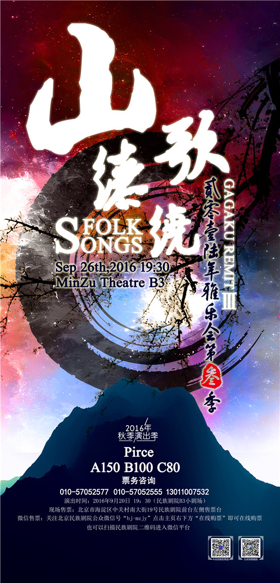 9月26日,《山歌缭绕——2016雅乐汇第三季》将在民族剧院B3小剧场上演。山歌是指人们在田野劳动或抒发情感时即兴演唱的歌曲,其内容广泛、结构短小、曲调爽朗、情感质朴、节奏自由 。山歌主要集中分布在高原、内地、山乡、渔村及少数民族地区,流传极广,是中国民歌的基本体裁之一。9月26日,一场“山歌”的音乐大餐将在民族剧院B3小剧场上演。