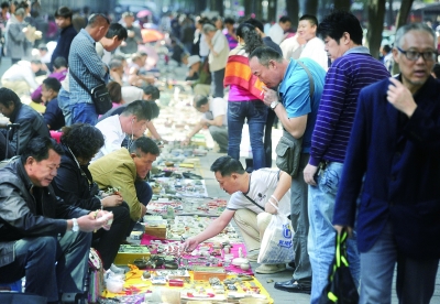 10月10日,收藏爱好者在地摊文化节上“淘宝”。当天,由省文化厅、省文物局和湖南日报等单位主办的第16届湖南文物(国际)博览会在长沙举行。本届博览会将开展文物交流会、文物“床交会”、首届傩文化展演艺术周和大麓古玩城地摊文化节等活动。