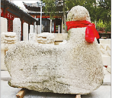 据介绍,这只带铭文石羊在后巷子村旧村改造时出土,高116厘米,长126厘米,重约1吨,系整块的花岗岩圆雕而成,屈膝而卧,昂头挺胸,作回眸状,羊角卷成“C”形依附在头后部,身体两侧羊毛采用同心圆的图案写意雕法,形象简约、庄重、大气。胸部刻隶书铭文“永寿四年四月廿六日辛未立羊所至公侯子孙宁”(永寿四年即公元158年)。