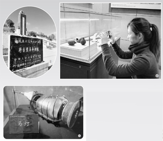 图①:将台堡革命旧址。 孙 湄摄 图②:观众在红军会宁会师纪念馆兴致勃勃地参观。 本报记者 郑海鸥摄 图③:宁夏西吉将台堡红军长征会师纪念园内收藏的红军曾使用过的马灯。 成 浩摄