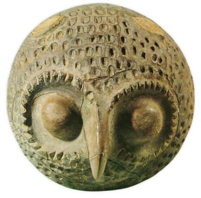 从远古时期开始,直到商代,鸱鸮都被视为神鸟。北京大学赛克勒博物馆就藏有一尊新石器时代的半球形陶鸮,原始时期此类圆雕通常都是祭祀对象或神祇;殷商时期,中原地区出土了大量以鸱鸮为表现对象的拟形青铜器、玉器,有些学者甚至提出籀文体“商”字(商代的国号)也是鸱鸮面部的正面写照,可见鸱鸮所扮演的重要角色。对此,学者们提出至少有三个理由可以进行解释:其一,鸱鸮是一种猛禽,在军事领域被视为吉祥物;其二,鸱鸮活动于夜间,是为夜神或梦神;其三,鸱鸮是祖先神,中国社会科学院考古研究所研究员何努进一步指出它可能还是商代的皇室图腾。但这样一个重要的信仰符号,主宰生死的至上神,在周代以后,迅速地从现实生活中隐匿,这与商的征服者周不无关系。朝代更迭使得鸱鸮失宠,但在墓葬这种地下语境中,它的传说还在继续。