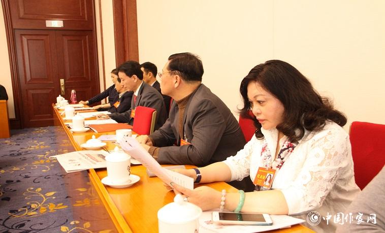 11月30日,黑龙江、四川代表团分组学习讨论,代表杨红樱认真阅读材料。