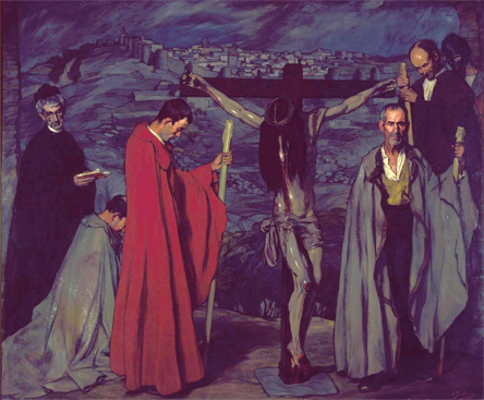 最先震撼我的是这幅画的尺寸。在马德里索菲亚王后国家艺术中心博物馆,伊格纳西奥·苏洛亚加(Ignacio Zuloaga,1870-1945)的《血基督》(El Cristo de la sangre)占据了展厅的整整一面墙。画面初看上去是阴森可怖的,一袭红袍在灰暗的背景中浮现,仿佛一摊鲜血。定睛看去,在前景中作为构图中心的是被钉在十字架上的耶稣基督。他的脸几乎完全被垂下的长发所遮蔽了,使我们转而去注意他的身体。他似乎刚刚死去,失去血色的肌肤上泛着冷光,血还在身上各处流淌。在耶稣的左右两边,各有三个人物形象,大致呈扇形排列。他们或是神甫,或是农夫,身披大氅,手执经书或是一人高的长烛,神情肃穆,沉浸在无尽的哀思中。在他们身后是西班牙卡斯蒂利亚高原的原野,贫瘠、悲凉而高贵,一座中世纪式的城市矗立在原野上,从城墙的形制看很可能是古城阿维拉。城墙、房屋和前景中的人物形象都是线描的,天空却是涂抹的,似是风云激荡,又好像是在燃烧,一如虔诚教徒狂热的信仰。