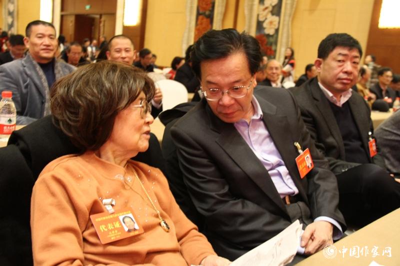 12月2日下午,文洁若、李福明等代表在报告会前交谈。