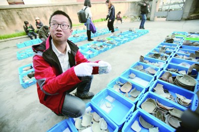考古工作人员向记者展示出土文物。青年报记者 吴恺 摄