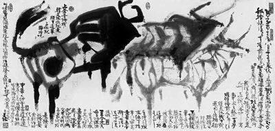 展览开篇同样别具一格,作为首先跃入参观者眼帘的板块“韩美林艺术大篷车”,它以编年史的方式,通过“时间轴”展现韩美林这些年行走江湖,向民间老艺人“求教”的点点滴滴。“没有这个‘大篷车’,就是说我如果不下厂,不下乡,就不会有这么多的创作欲望,也没有这么多的形象,民间艺术对我的帮助太多啦。”韩美林说,每次和老乡在一起,他都感觉特别踏实,不光学习画画、剪纸、面塑、捏泥人儿,还有秦腔、评弹、黄河大锣鼓和舞蹈。“我一辈子受延安的那些老革命艺术家的影响,艺术家不下去不行。你看我们现在美术学院的一些学生,会画的又有几个?都是拿着电脑闭门造车。真功夫还在行万里路。”他半开玩笑地说,他如今的构思稿即便用上二百年都用不完。这也是他的创作里很少发现重样内容的奥秘。