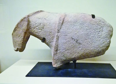 在“人形石碑”单元,我们可以看到有着一百多万年历史的石制生产工具,包括石斧、刮削器、箭镞等,向人们诉说百万年前阿拉伯人祖先的艰辛与智慧。展柜里有一件石马,只残存着头部和躯干。然而,可别小看这个貌不惊人的石马,它可是距今一万年前的石雕。它从鼻子至肩部的脊状有着明显的刻画,沙特的专家说,这些刻画很可能代表着早期的缰绳。也就是说,在那个时期,沙特地区的人们可能已经拥有了驯化马的技术。而在此之前,人们多认为马的驯养最早发生在公元前3500年的中亚地区。