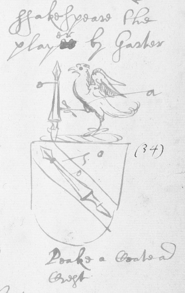 莎士比亚家族的盾徽大概是什么样子,我们早已知道,因为莎士比亚墓碑的上方就有(图2)。另外,早在1908年之前就已经有7幅莎士比亚盾徽草图被3家机构收藏,位于伦敦的英国盾徽院藏有4幅,牛津大学图书馆藏有1幅,美国的福尔杰图书馆藏有2幅。这些盾徽草图与之莎士比亚墓碑上的盾徽大同小异。盾冠是一只展开双翅的隼。莎士比亚生前最喜欢这种猛禽,其著作中隼字出现的次数高于任何其他鸟名。隼的一只爪抓着一根矛(spear)的柄,用来会意构成Shakespeare这一姓氏的shake和spear(“摇动”“矛”)。盾徽本身的图案是,以一条黑带为背景,黑带上一只矛斜贯整个盾徽,矛尖与笔尖相似,矛柄与笔杆相似。这恐怕不是偶然巧合,而是暗示威廉·莎士比亚的作家身份。福尔杰图书馆收藏的草图中,有一幅的图案下方标注着“戏子莎士比亚,袜带骑士绘”的字样(如图3)。照理说,既然没有任何证据表明伦敦当时有两个同叫莎士比亚的戏子,或一个戏子,一个作家,盾徽草图和墓碑上的盾徽便构成一个证据链,证明伦敦的戏子莎士比亚和葬于斯特拉特福镇的莎士比亚是同一个人。然而倒莎派提出,这两个盾徽都是莎士比亚去世之后雕刻或绘制的,不足为凭。