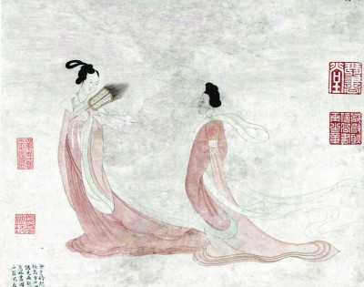 过云楼旧藏明代文徵明湘君湘夫人图轴(局部)。
