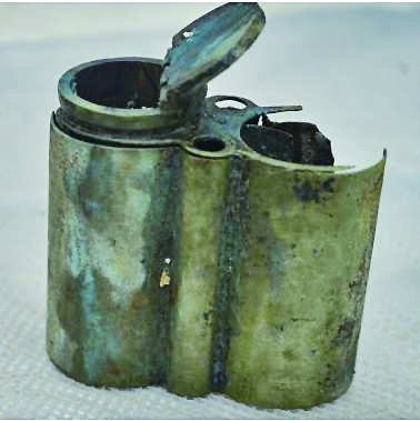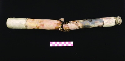 图为陈金揆单筒望远镜,保存基本完好,仅中部被挤压破碎,包括三个目镜片、一个物镜片。该望远镜全长50厘米,物镜7厘米。物镜上刻有英文花体字,初步辩识为“Chin Kin Kuai”,为致远舰大副陈金揆的英文名字。