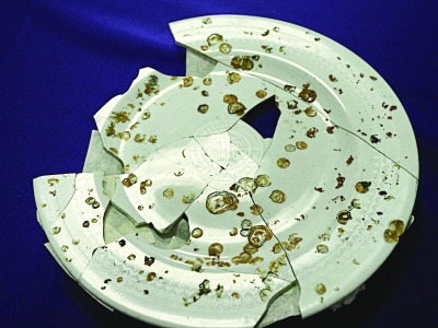 “致远”篆书白瓷餐盘。盘心有篆书“致远”二字,外圈为字母,上半圈为“CHIH YüAN”(致远威妥玛拼音),下半圈为英文“THE IMPERIAL CHINESE NAVY”,组合成一个圆形徽标。盘口沿处一圈锦纹,纹饰原有描金,因海水浸蚀仅留下纹饰印痕。口径20.5厘米、底径11.5厘米、高1.5厘米。