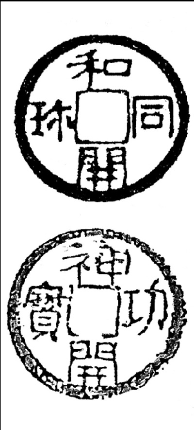 图④:日本的开宝——“和同开珎”“神功开宝”。