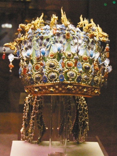 在中国,珍珠被用作装饰的历史,可远溯至周朝初始,据《格致镜原·妆台记》记载,周文王曾用珍珠装饰发髻。秦汉之后,珍珠饰品迅速普及,帝王将相、达官贵人无不以珍珠装饰为荣。最好的例证是北京定陵出土的明万历时的龙冠和凤冠,其上都装饰了规模不等的天然珍珠,向世人展示着古代宫廷工艺的豪奢,如现为中国国家博物馆收藏的孝端皇后的“九龙九凤”冠(见图一),龙凤口中都衔有包含珍珠在内的珠宝,冠面更镶嵌珍珠5000余颗。至清朝,皇家对天然珍珠的喜爱显然到了极致。传世的一件清代道光年间的龙袍,前后两面的9条龙图案均由数以万计的天然淡水小珍珠绣制而成,制作可称巧夺天工。
