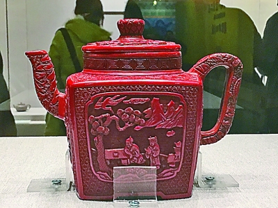 紫砂胎剔红山水人物图方执壶 本报记者 苏雁摄/光明图片
