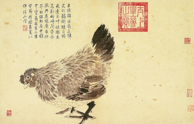 不过,明代画家沈周笔下的雏鸡恐怕就少了几分农事意味,反而多了不少文人意趣。在他的《卧游图册》中,有一开仅仅描绘了一只雏鸡。画家用丰富的墨色层次,以简约的造型表现出雏鸡可爱的模样,已经不似李迪那样精细。沈周的雏鸡似乎只为表现物像本身而作,并没有太多别的想法。除了雏鸡,沈周也描绘过家乡的母鸡。在这件作品中,画家用墨更为考究,似乎着意通过墨色变化来反映母鸡的毛色,用笔也更为简率,颇有文人趣味。而文人画家之所以能够对鸡入画表示认同,不仅因为他们自己的兴趣所致,更因为鸡作为“德禽”获得了他们价值观上的认同。