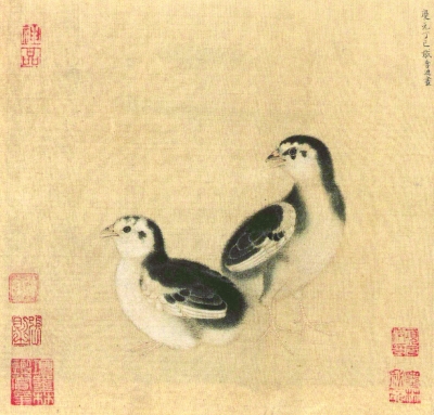 子母鸡题材的流行,表明雏鸡进入了画家们的视野。现存较早描绘雏鸡形象的画作,可能出自南宋画家李迪。北京故宫博物院现藏有传为他所作的《鸡雏待饲图》。画面描绘了两只雏鸡背向而立,却一同张望着画面的左方。由于是描绘在绢素之上,画家用精细的笔法描绘例如足部、翅尖等细节,又略微晕染出羽毛的边缘,工致与意趣兼备,十分耐看。南宋兴起了一种描绘田园风光和生活主题的绘画,李迪便是主要代表画家,这件《鸡雏待饲图》可能便是农村生产的写照。而在传统农业生产中,将大寒分为三候,认为“一候鸡乳”,此时开始孵育雏鸡,表明新春即将到来,可以为来年的农业生产做准备了,是十分重要的节气标志,这可能也是李迪创作此画的原因之一。