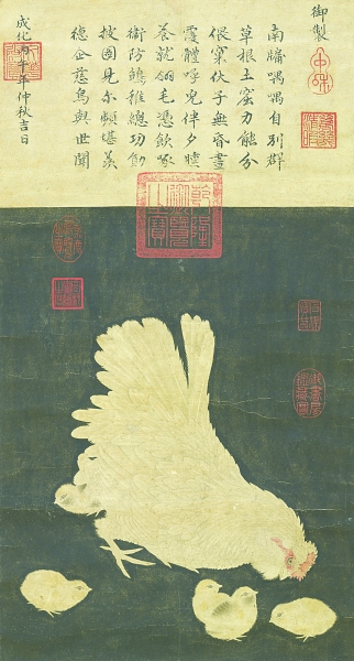子母鸡是描绘老鸡与幼畜相处的绘画题材。这种题材最早可以上溯到宋代,台北故宫博物院便存有定为宋人所作的《子母鸡图》。这件作品在黑地上描绘一只白鸡与五只幼畜相处的场景。画家的描绘十分写实,甚至连鸡身上的羽毛也一一分明地画出,这与《芙蓉锦鸡图》的技法如出一辙。不同的是,《子母鸡图》的画面情节感并不强。五只小鸡相互顾盼,还有的躲在母鸡身后,与母鸡一同构成了简单的画面。但是,画家在处理此作时,运用了三角形的稳定构图,这不仅使得画面看上去更加安稳,更形成了此类作品的固定模式。这种模式很容易使人产生政治上君父臣子、统治稳固的联想,而该作上方明宪宗朱见深的题诗仿佛也印证了这一点。值得注意的是,作为宣宗的孙子,宪宗也是一位擅长绘画的皇帝。