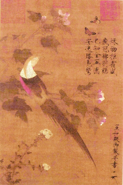 现存北京故宫博物院的传为北宋徽宗所作的《芙蓉锦鸡图》,便是一件不同以往的鸡画佳构。这件作品看似简单,描绘了一只俏立芙蓉枝头的锦鸡。这种锦鸡不同于家鸡,是宫苑中豢养用于观赏的名贵品种。画中的锦鸡,羽毛华丽,回首凝视着画面右上角的一对蝴蝶,目不转睛。尽管同样是圆睁着眼,却全无《斗鸡图》中的杀气,一副柔和呆萌的模样。而它的目光所及之处,不仅有翩翩起舞的彩蝶,还有徽宗书写的诗句:“秋劲拒霜盛,峨冠锦羽鸡。已知全五德,安逸胜凫鹥。”既然已经具备了“五德”,那人生的至高境界已经到达,便可过起安逸的生活——这是徽宗对这件作品的注解。由斗鸡的癫狂到锦鸡的闲适,变化的不仅是画面的内容,还有时代的风格与趣味。
