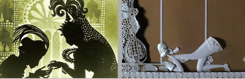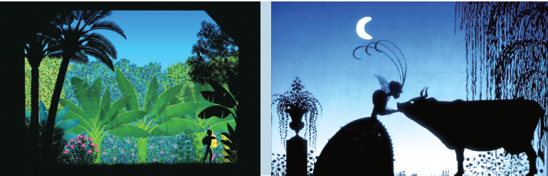 剪影动画与剪纸动画有相似之处,即角色都用剪纸方式制作,并根据动作需求将肢体拆分为元件。不同之处在于,剪影动画通过光线对角色的照射在银幕上呈现出黑色的轮廓剪影,造型没有进行颜色的区分,增强整体感的同时也摒弃了影调的细节。世界上较早采用剪影这一形式进行动画创作的是德国女导演洛特·雷妮格,她最著名的作品是1919年的长片动画《阿基米德王子历险记》。雷妮格的剪影作品精致细腻,可惜的是,《阿基米德王子历险记》的电影胶片在二战中遭到损毁,遗失了部分背景细节。在修复后,由于放映速度的问题,影片长度也由90分钟缩短为65分钟。