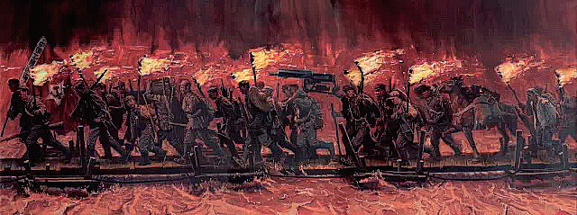 而中国美协策划组织、由七大美院教授团队和军旅美术家历经一年艰辛构绘的12幅大型(3m×8m)长征题材历史画创作,或许也最饱满地呈现了当代文化对于长征精神的审美释读。从《血战湘江》到《遵义曙光》,从《四渡赤水出奇兵》到《飞渡泸定桥》,从《翻越雪山》到《大会师》等,这些长征重大事件的史实虽在以往画作中都有不凡的表现,但在这12幅大型历史画巨作中,我们既看到了在以往的画作上不曾看到的宽广的历史场景,也看到了我们这个时代对于历史真实性的深度理解,更从长征曾经历过的困苦、鏖战、跋涉和牺牲里,阅读到了我们这个民族在极度艰难困苦的压榨中而被塑造出的英勇无畏的民族灵魂。尤其是《飞渡泸定桥》以并非写实的现代主义表现性艺术语言,对于强渡泸定桥的战士形象与整体氛围的再造,体现了当代美术对于现实主义创作理念的新发展。而《四渡赤水出奇兵》则将第三渡虚张声势的佯攻与抒情写意的意境营造融合一体,体现了艰苦战争的浪漫主义情怀。应当说,这些画作是国家历史记忆中值得人们长久回味的长征图像,其无比震撼的诗史性的宏大叙事,正是我们今天对于民族精神的另一种审美构建。