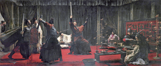 史诗无疑是对一个国家、一个民族在历史发展的重大转折与艰难蜕变中出现的历史事件和民族英雄的书写与歌颂,也是以诗的情怀对于历史的宏大叙事与艺术再构。通过艺术创作所记录所传诵的这些事件与人物,由此而获得了一种穿越历史限度的永恒性,并成为激发民族斗志、铸造民族灵魂的一种文化象征。史诗无疑也是一个伟大时代民族精神的浓缩,一个伟大民族在一段历史巨变的急流中启航与远行的艺术见证。这或许也阐释了在这样一个风云际会的大变革时代,为何以造型艺术的方式来再现中华文明历史的美术创作工程呼之即出。当它们以凝重的笔调勾勒出泱泱大国五千年文明演进的壮阔图景时,这些皇皇巨制既是对中国艺术史缺失古代视觉艺术史诗的弥补,也是我们这个时代对中华史诗的视觉书写与民族精神的形象塑造。