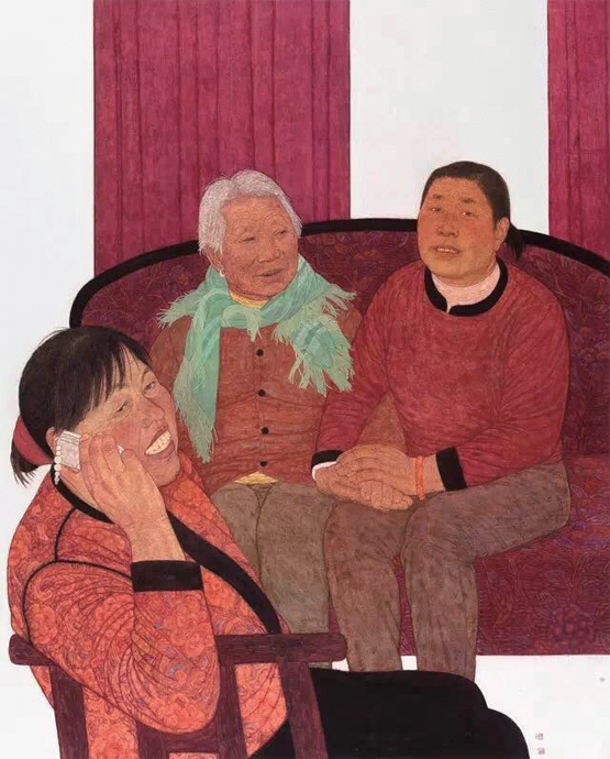 其中,给人印象深刻的当属“向人民汇报——20位中青年美术家深扎作品展”,此展是继2015年举办“当代15位美术家深扎作品展”之后,着眼于呈现当代中青年美术家深扎主题实践的展览。此展不仅在年龄选择上以“70后”、“80后”画家为主,而且出展作品都是这些画家长期深入他们钟情的某一生活基地而不断积累、长期沉淀的作品。譬如,持续关注城市农民工生存状态的李传真,此次回到了她曾下放过的湖北三湖农场,创作了《放学》《暖阳》和《婆·媳》等工笔画,作品着重刻画了那些乡亲们明朗、欢愉、自足的精神面貌与生活情态。这种具有生活温度的画作,还使得工笔人物画在深化写实程度的同时,也深刻体现了从西式写实再度向东方写意回归的艺术探索。作为蒙古族画家,鲍风林在采风写生基础上创作的《长调草原》,从现代文明的视角发掘了游牧民族原生的文化形态,画作通过对草原长调歌咏的表现,展现了宽广恢弘的民族史诗,水墨基调也由此显得苍茫凝重。应当说,深扎主题实践,让许多中青年美术家找到了艺术创作与艺术创新的根脉。一方面,他们从人民深厚的生活土壤里发掘出普通人的精神境界,并在清新艺术语言的开拓中最大限度地表达了人民的思想情感;另一方面,他们从全球化视野和现代文明角度对于中国传统文化的再发现,也在很大程度上影响了他们艺术探索的路向,从而更加坚定了他们从本土的现代境遇中探寻自主发展道路的信心。