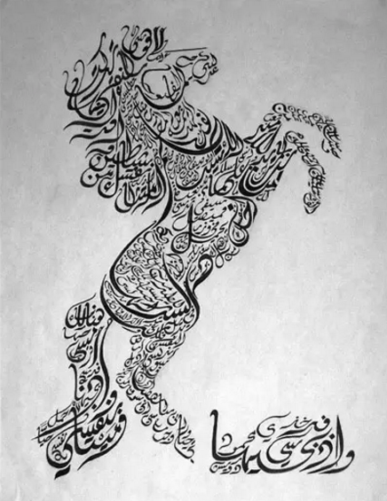 这张阿拉伯文书法画是马哈茂德·达尔维什一首名为“Take My Horse and Slaughter It”诗歌的诗词。书法从马首到马尾一次完成,右下角是作者的名字。