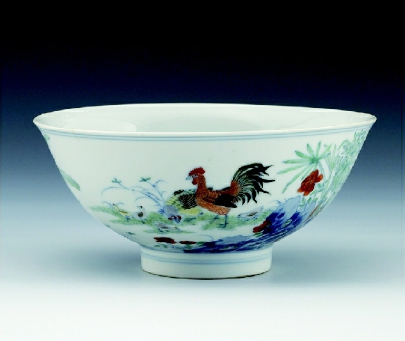 清雍正景德镇窑斗彩芭蕉群鸡纹碗