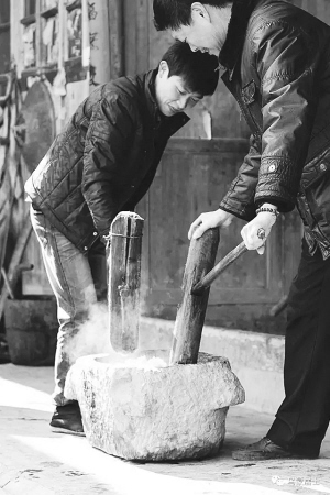 打糍粑是个体力活,也是门技术活,一般都由男人完成。打糍粑的地点,一般在堂屋或者门前的院坝里,空间大,摆得开。把糯米饭倒入石槽或木槽后,男人们就撸起袖子,拿起粑粑棒,趁热打糍粑。先是揉,尔后挥棒,精准发力,直落槽中——村寨里响起春节前的交响曲。
