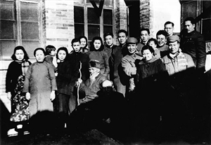 ▲在大雅宝胡同甲2号庆祝白石老人九十寿辰合影。中为齐白石、前为李苦禅,左5为齐良迟(齐白石四子)、左7-11分别为廖静文、徐悲鸿、齐良已(齐白石五子)、李可染、王朝闻。李瑞年(右1)、叶浅予(右2)、滑田友(右4)。李苦禅之子李燕供图